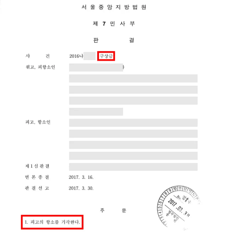 결국 위 사진에서 보시듯, 피고의 청구는 깔끔하게 전체 기각으로 끝났습니다.