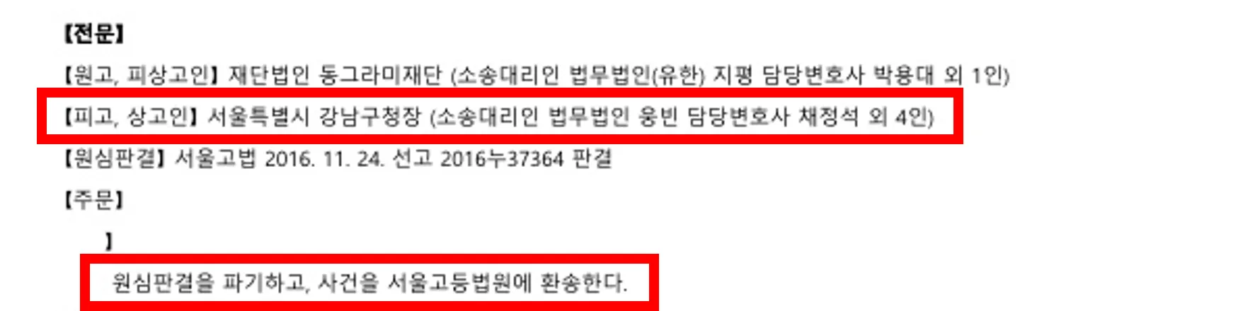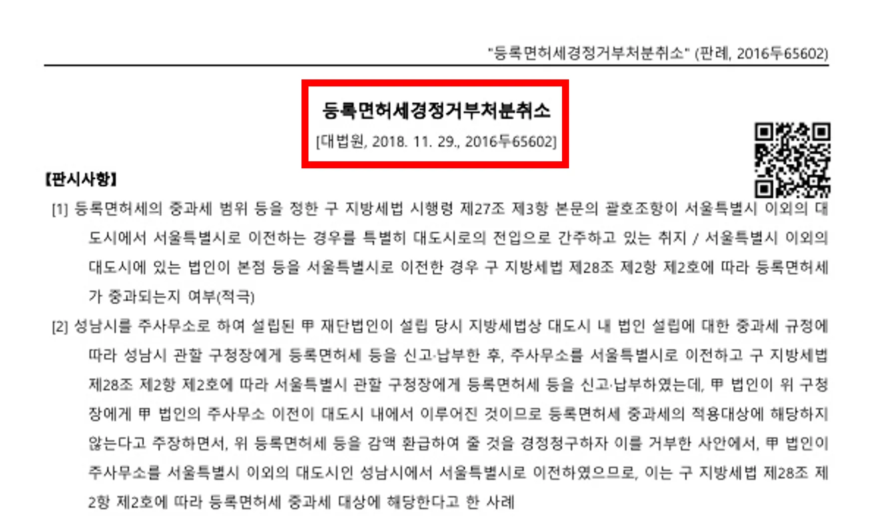 법인을 새로 만들거나 다른 곳으로 옮기는 경우에는 “등록면허세”를 내야 하는데요. 이때 도심과밀화 등을 억제하기 위해서 대도시로 전입하는 경우에는 중과세를 하게 됩니다. 원고는 성남시에서 서울시로 법인 주사무소를 전입하게 되었는데요. 이때 강남구는 이를 대도시로의 전입으로 보아서 중과세를 하였고, 원고는 중과세 요건에 해당되지 않는다고 하여 이 소송을 제기하였습니다. 강남구의 의뢰에 따라 김지원 변호사가 이 사건을 담당하게 되었습니다.